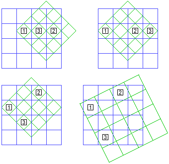 The third piece might define things better. Some possible third piece plays are shown in the diagrams with possible notional grids. Note that the size and even the orientation of the notional grid may remain undefined until more pieces are played. Future plays must conform to at least one possible notional grid. Eventually the exact grid size, placement, and orientation is uniquely determined, and play continues using that notional grid. Note that pieces are always assumed to be at or very near the centre of their notional grid squares.