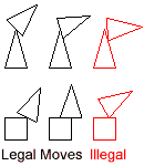 If a potential Move is blocked by other pieces in the way, simply nudge them gently any way you feel like until there is just enough room to place the newly moved piece - this is a contact sport after all! If this causes more pieces to be shoved around in a chain reaction, so be it. This is not a licence to shove pieces all over the place - any piece moved must still be in contact with whatever piece pushed it. You are also not allowed to deliberately turn a piece through a larger angle than required to nudge it out of the way.